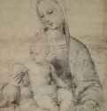 Мария с младенцем резко контрастируют с ним – они выглядят молодыми, практически сияющими в этой молодости. Мария просто одета, волосы убраны под платок. Младенец на её руках держится за неё, изворачиваясь так, как могут извернуться только очень маленькие дети, которым удобно практически в любой позе.