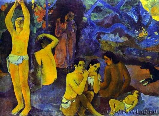 Описание картины Поля Гогена: Откуда мы пришли? Кто мы? Куда мы идем? В 1891 году Гоген решил отправиться на Таити, так как духовно он был приближен к обществу белее духовному и простому, чем его франузское окружение. Там и начал рисовать эту картину несколькими годами позже (1897), а закончил в 1898 году. По мнению самого художника это произведение имело возвышенную кульминацию его собственных размышлений. В 1898 году Гоген переправил свое произведение Джорджу де Монфрейду в Париж. Позднее эта картина перепродавалась множеству других европейских торговцев и коллекционеров до того момента, пока ее не приобрела Галерея Марии Гарриман в Нью-Йорке в одна тысяча девятьсот тридцать шестом году. Позднее ее перекупил Бостонский музей искусств. У Гогена были мысли о суициде после того, как он закончил работу над этой картиной. Он подчеркнул, что картина должна читаться справа налево, так как основные группы фигур дают полную иллюстрацию вопросам, которые поставлены в названии. Три девушки с ребенком повествуют нам о начале жизни; средняя группа повествует нам о ежедневном существовании зрелости; заключительная группа, а точнее старая женщина, идущая все ближе к смерти, на первый взгляд может показаться смирившейся и отдавшейся своим размышлениям, а у ее ног изображена белая птица, которая представлена в виде бесполезности слов. Изображенный голубой идол на заднем ракурсе скорее всего повествует о потустороннем мире. Что касается полноты картины, то он заявил следующее: «У меня есть вера того, что это полотно имеет превосходство не только перед всеми моими предыдущими, но и то, что я уже никогда не смогу создать более лучшее или похожее произведение» Картина по праву успела заслужить статус ключевого и новаторского произведения постиприссионисткого стиля Гогена; его искусство присуще четкому использованию красок и толстым мазкам, и одновременно стремиться передать присутствие эмоциональной или экспрессионистской силы.