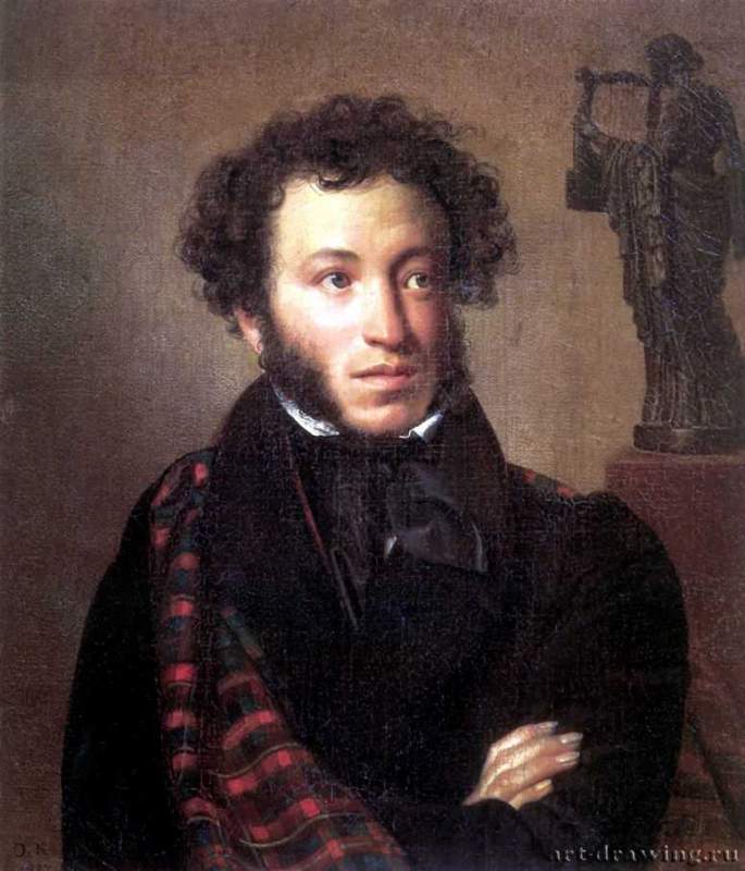 Первое впечатление от портрета - впечатление предельной завершенности. Тщательная отделка деталей, строгая гармония целого создают ощущение торжественной тишины. На светлом желто-зеленом фоне - изображение поэта, одетого в строгий сюртук с перекинутым через плечо клетчатым красно-зеленым шотландским пледом (некоторые исследователи называют его плащом). Изящная фигура написана в фас, лицо поэта обращено слегка направо, в ту сторону, где в глубине, за креслом, стоит бронзовая статуэтка Гения с кифарой в руках. В лице поэта Кипренский мягко передает его характерные «арапские» черты.
