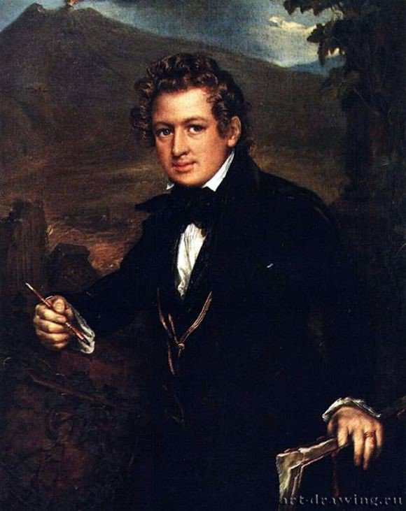 Описание картины Василия Тропинина: Портрет Брюллова. Когда художник изображает далеких от теории искусства людей – это привычно. Но если мастеру кисти доводится браться за работу над портретом коллеги живописца – дорогого стоит умение впечатлить коллегу. Такой является картина В. А. Тропинина: на ней русский ваятель реализма и романтизма написал парадный портрет К. П. Брюллова. В конце 1835 г., завершив европейское путешествие, Карл Брюллов заезжает в российскую столицу. Москва встретила родного живописца пышными культурными приемами. Что касается соотечественника и друга по увлечению изобразительным творчеством – Василия Тропинина, его слава потрясающего портретиста вышла за пределы страны и была уже известна нашему приезжему художнику. Удостоив вниманием местных аристократов и других ценителей искусства, Брюллов уже в 1836 г. отправился на знакомство в творческую мастерскую Тропинина. Результатом бесед двух влюбленных в живопись сердец стала плодотворная дружба. Василий Андреевич перенял некоторые художественные навыки и приемы, бытующие в Европе. Главный плод их товарищества – прекрасное полотно – портрет К. П. Брюллова. Художник написал коллегу в красивом костюме. Черный пиджак, белоснежная рубаха под ним и подвязанный пышный бант – изящная одежда интеллигенции того времени. Правой рукой изображенный удерживает кисточку, а левой – приоткрытую папку с холстами. Мастер кажется нам внимательным и всегда готовым к работе над очередным шедевром. Фон картины занимает античный пейзаж. Это своеобразный отголосок знаменитого полотна Брюллова о гибели Помпеи: каменные развалины и пылающая вершина вулкана. Карл Павлович смотрит на зрителей с достоинством и благородством. В картине отражена благодарная гордость автора за дружбу со столь знаменитым и прекрасным живописцем и причастность к единому делу запечатления действительности для увековечивания мгновений.
