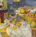 Полотно написанное Полем Сезанном, под названием «Натюрморт Кувшин и Фрукты» показывает как на столе, довольно неаккуратно уложена белая простыня, на которой уложены фрукты и стоит кувшин.