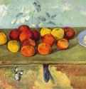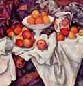 «Натюрморт с яблоками», написанный в 1890 году, поражает богатством цветов, внутренней простотой и одновременно многогранностью обыденных вещей. Композиционный центр полотна занимает белая тарелка с яблоками. Эти фрукты идеальны: они ярко-красные, наливные, спелые, ровной и одинаковой формы. Видно, что яблоки зрели и наливались под ласковыми солнечными лучами. Авансцену полотна занимают еще несколько фруктов: два зеленых яблока и ярко-желтый лимон. Сезанн мастерски находит место фруктам на картине, его мазки просты и точны.