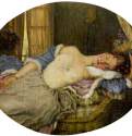 Волосы у девушки кудрявы, лицо не просто безмятежно, как у любого спящего, но радостно, словно ей снится что-то приятное. В ногах у неё сидит тощая сердитая собака, которая выписана настороженной и внимательной – она охраняет хозяйку и готова укусить любого, кто на неё покусится.